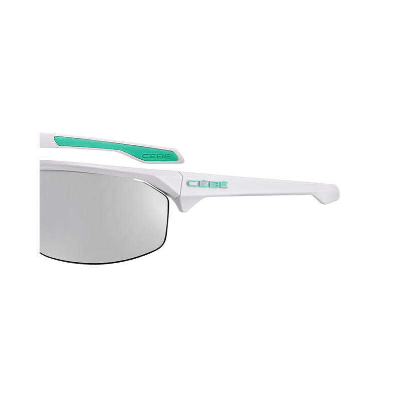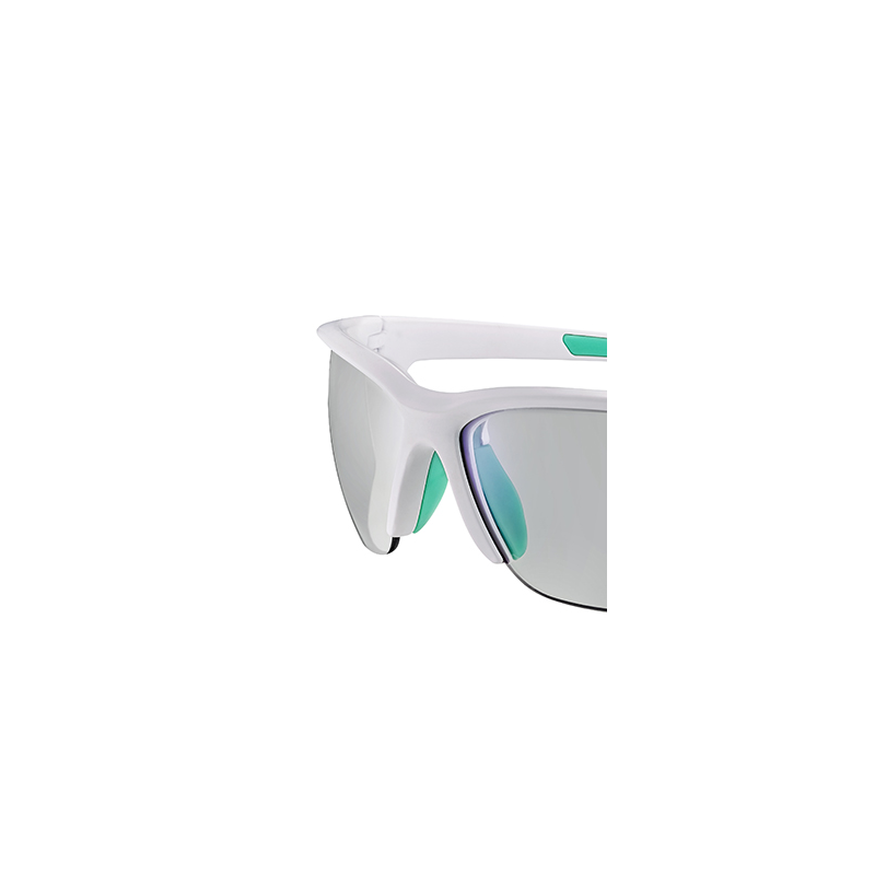Gafa deportiva con lentes fotocromáticas, varillas de caucho y almohadillas ajustables a la nariz.