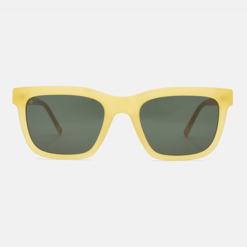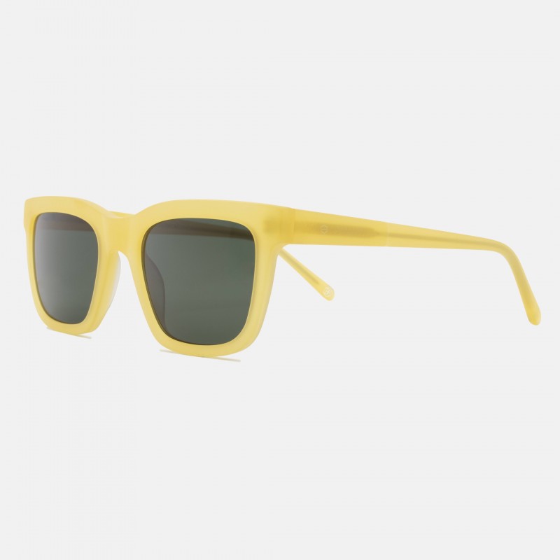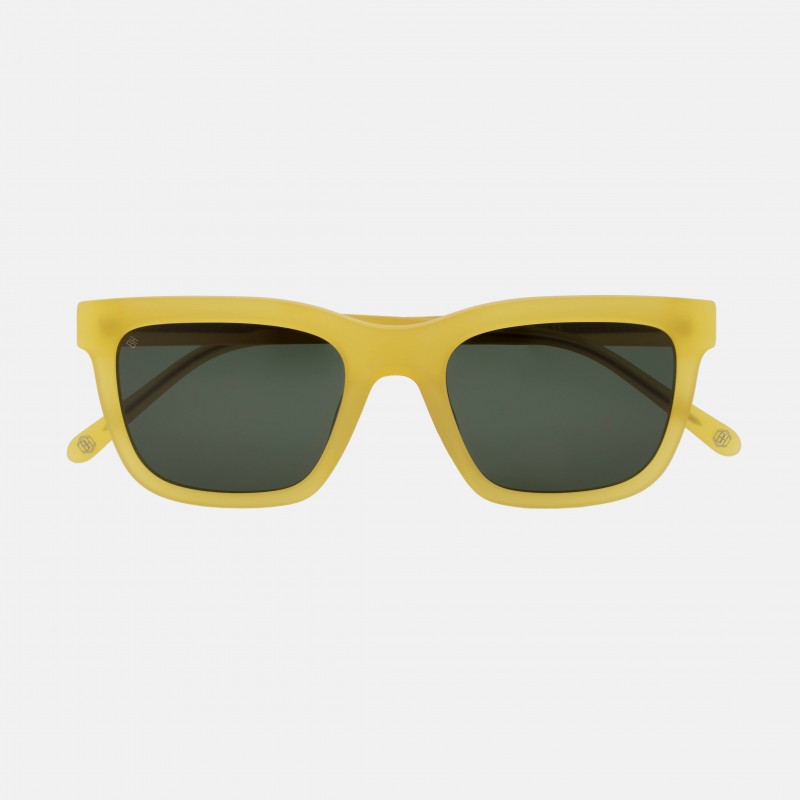 Gafas de sol con forma cuadrada, montura en acetato color amarillo mate y lentes en color gris verde.