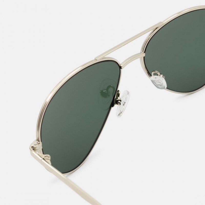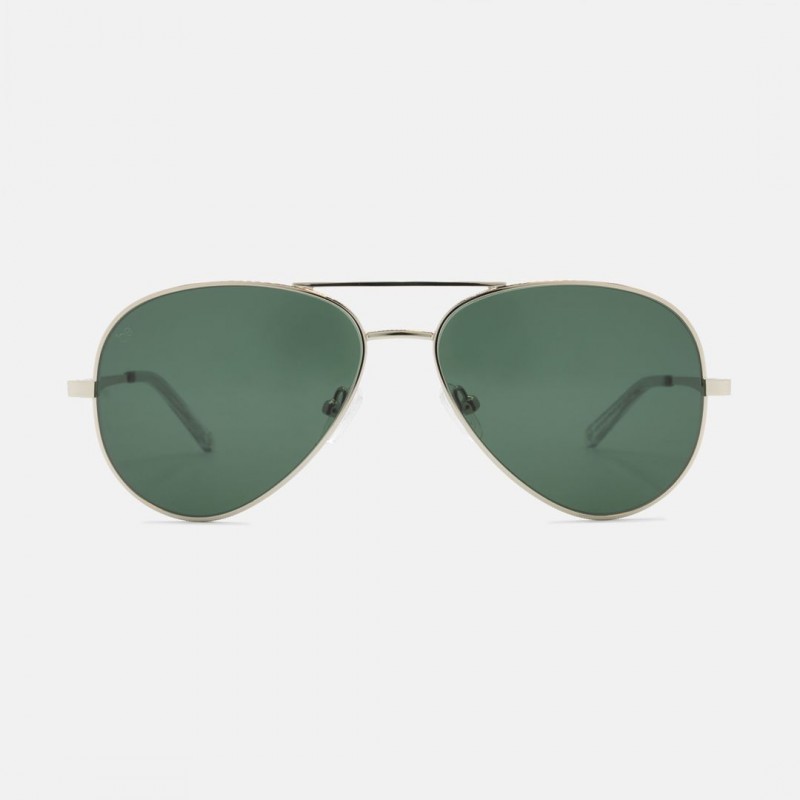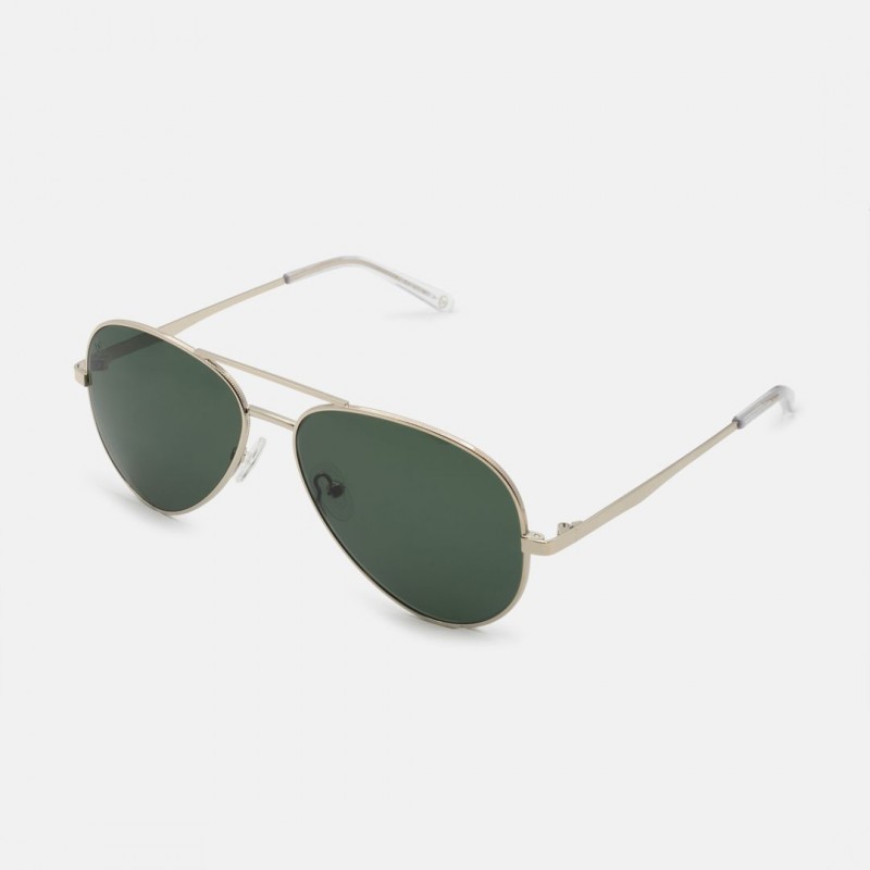Gafas de sol con forma de piloto en dorado combinado con terminación de varillas con terminal transparente y lentes en color gris verde.