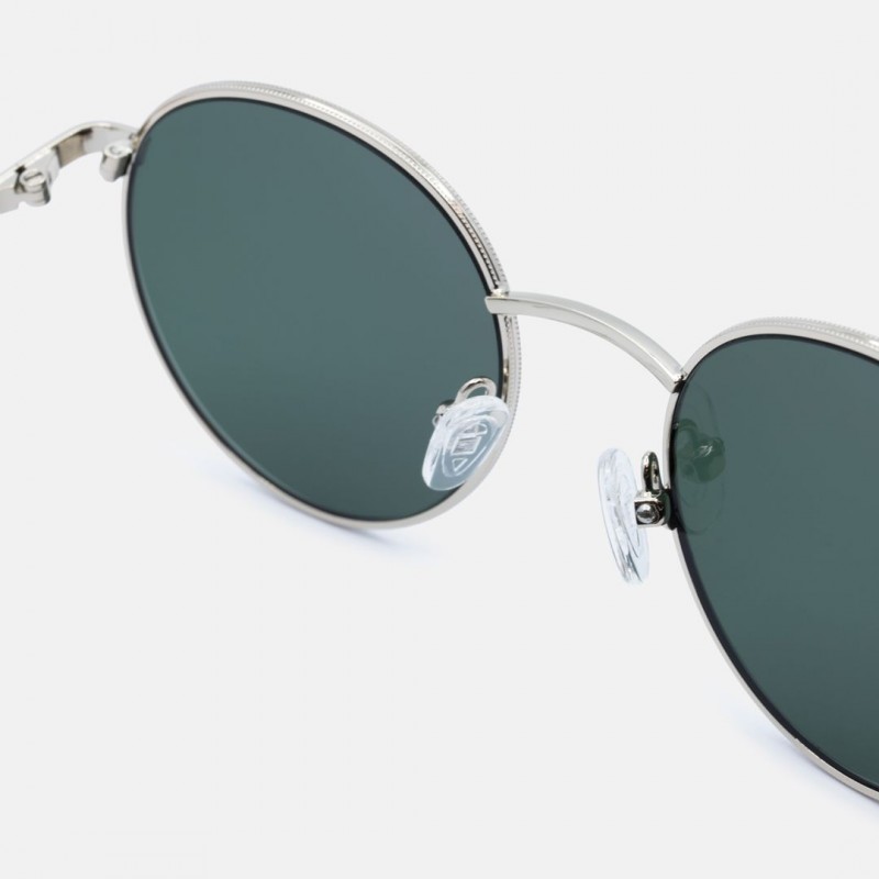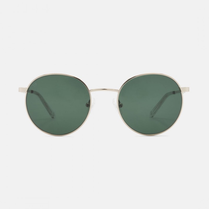 Gafas de sol con forma redondeada en dorado combinado con terminación de varillas con terminal transparente y lentes en color gris verde.