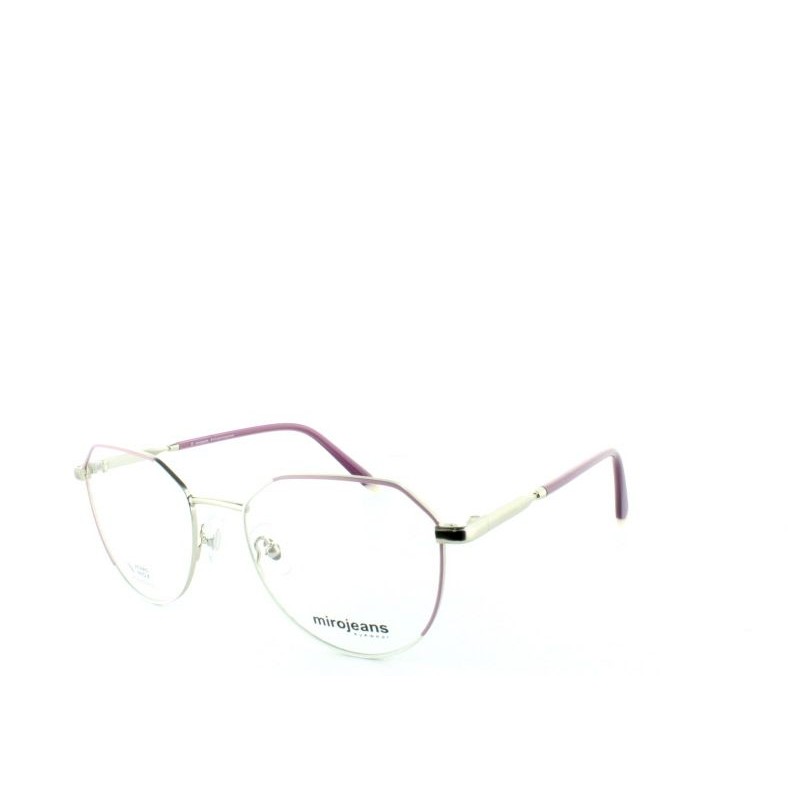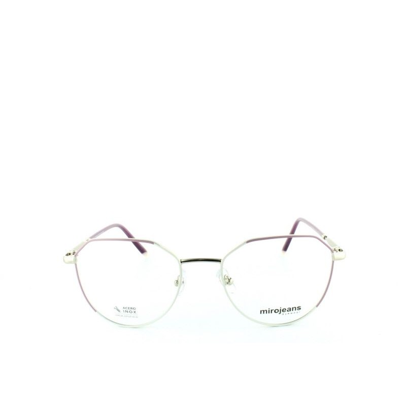 Montura en acero inoxidable hipoalergénico con forma redonda imitando forma de aviador en color mate combinando los colores blanco y malva claro. Varillas redondeadas recubiertas en acetato color malva traslúcido con terminación en detalle marfin.