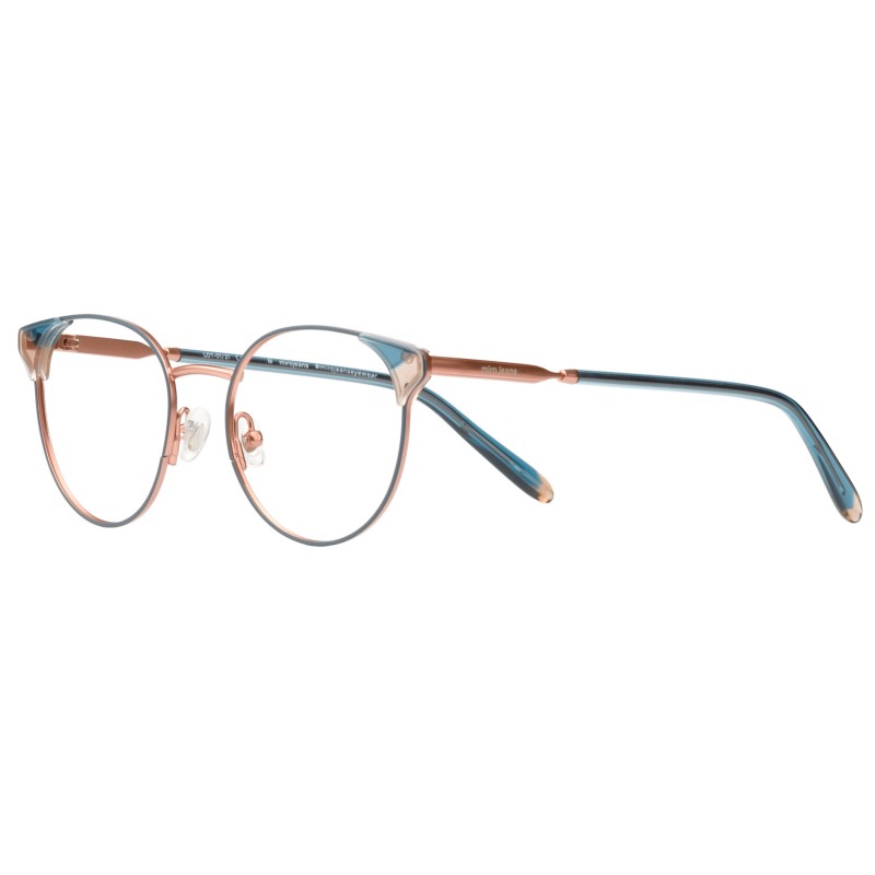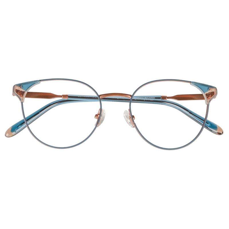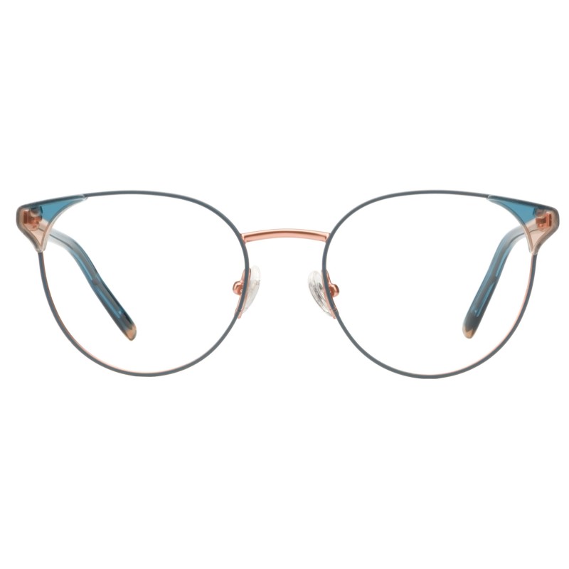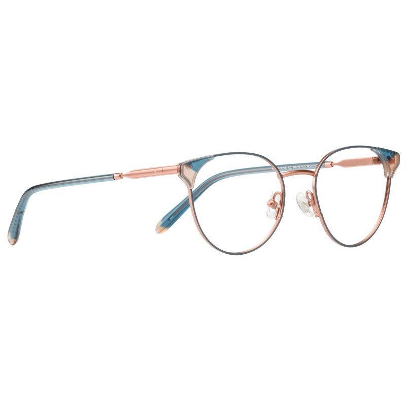 Montura en acero inoxidable hipoalergénico con forma redonda algo agatada en color azul mate combinando los colores turquesa y dorado cobrizo. Varillas redondeadas recubiertas en acetato color azul turquesa traslúcido con terminación en detalle marrón traslúcido.