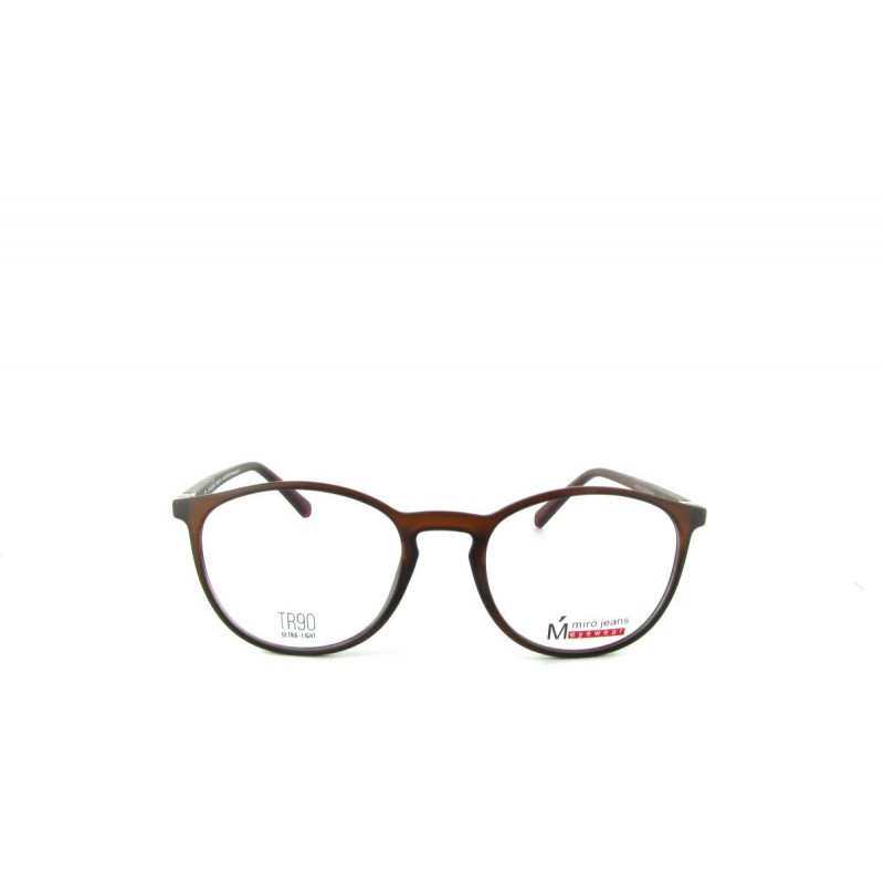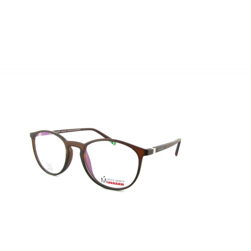 Montura en TR90 muy ligero en color marrón mate traslúcido, forma redondeada.