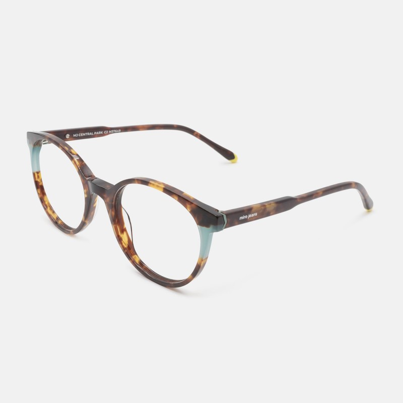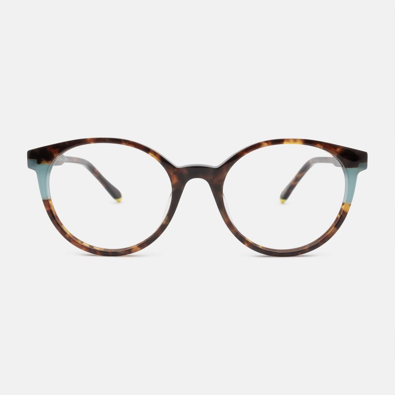 Montura en acetato con forma redondeada en color habana y detalles en verde y amarillo.