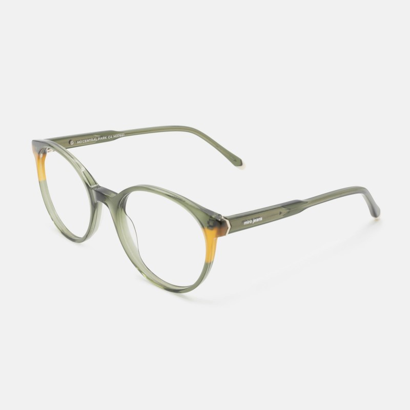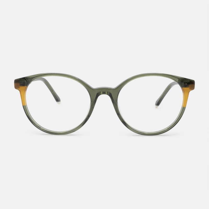 Montura en acetato con forma redondeada en color verde traslúcido y detalles en color miel y ocre.