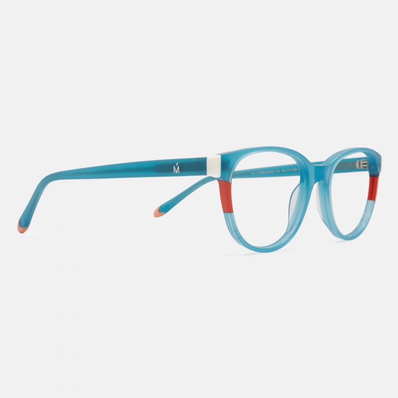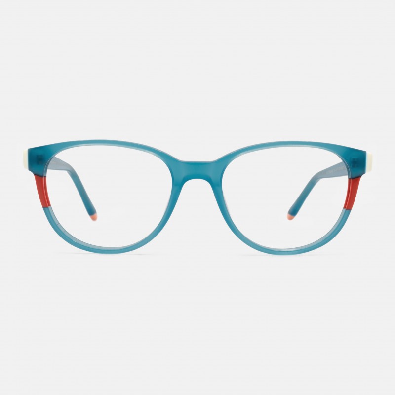 Montura en acetato con forma redondeada en color turquesa y detalles en color rojo.