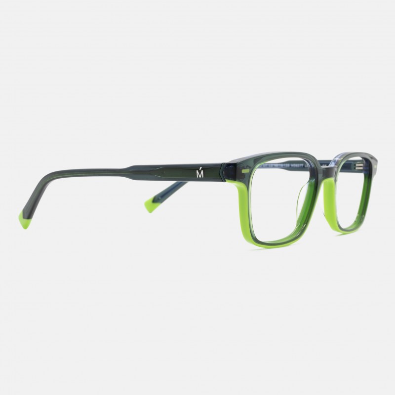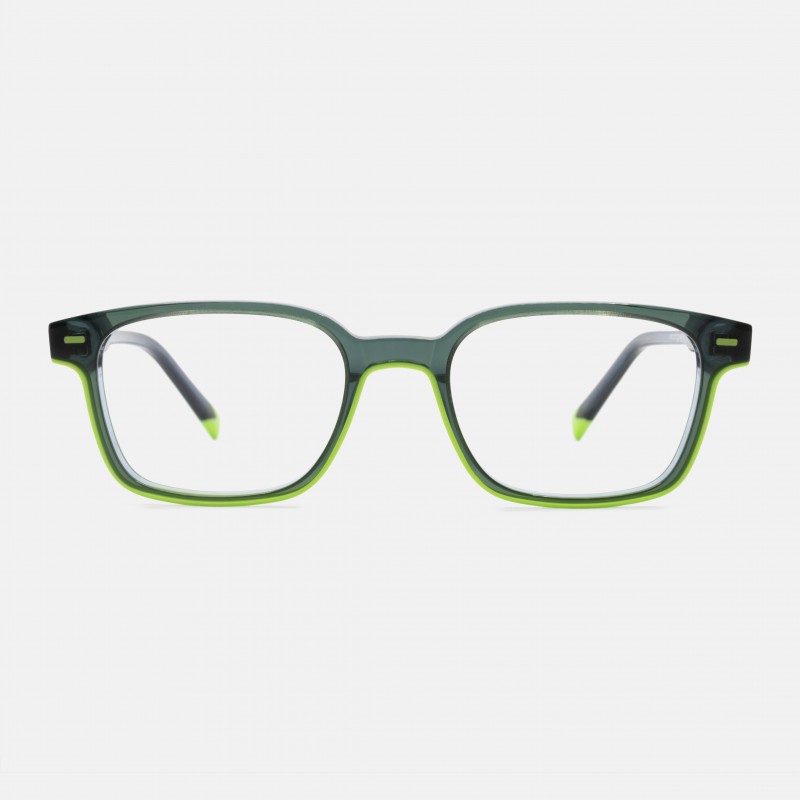 Montura en acetato con forma cuadrada en color verde traslúcido y verde flúor.