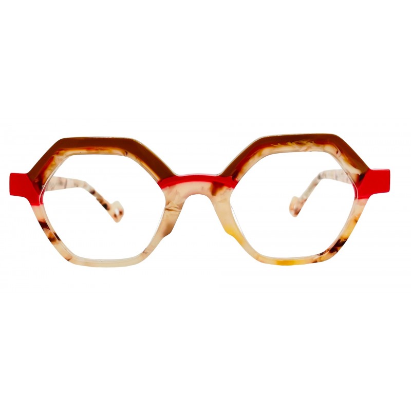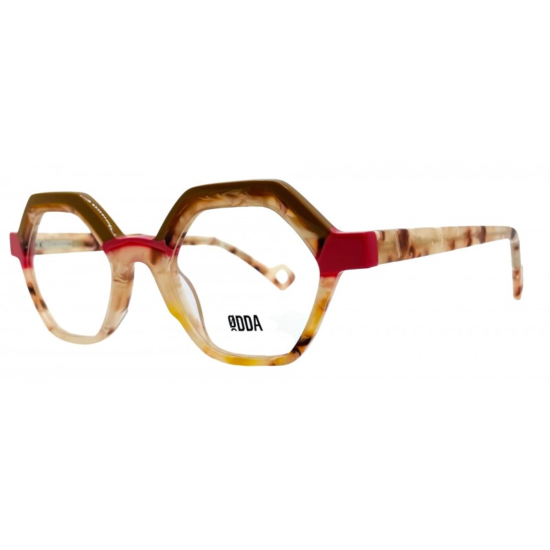 Montura en acetato con forma hexagonal en color animal print coral (el color que aparece rojo en puente y talón es coral)
