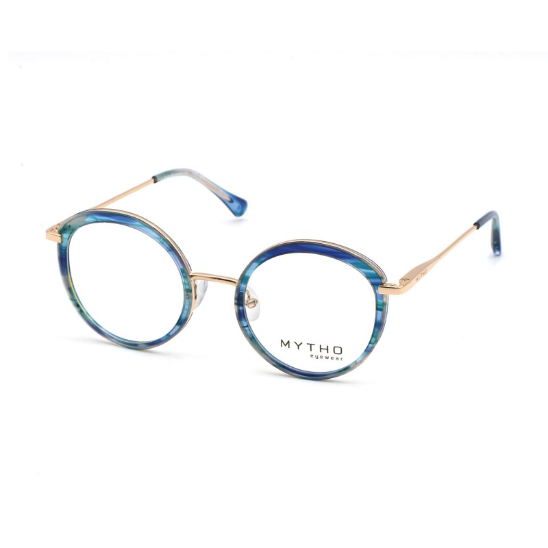 Montura combinada en metal y bioacetato de gran calidad con forma redondeada algo agatada y en color azul turquesa y dorado.